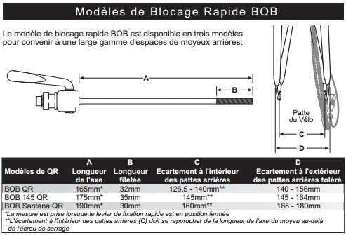 - Pour les vélos avec axe à serrage rapide, longueur de l’axe : standard QR de 165 mm, tandem (145 QR) de 175 mm et oversize (santana) de 190 mm