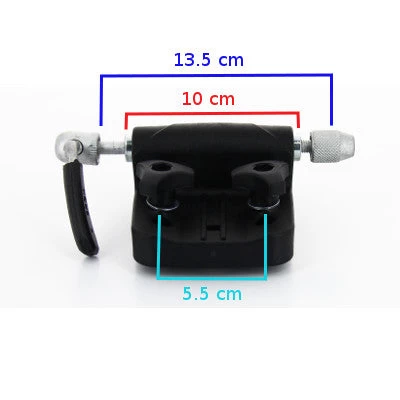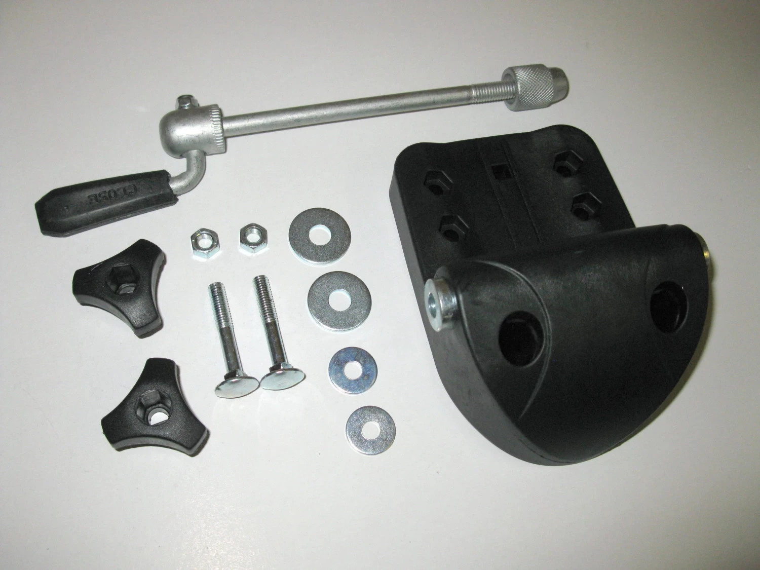 La fixation permet d’attacher le vélo par la fourche, une fois la roue avant démontée. L’axe de 15 cm de long s’insère dans les trous de la fourche qui doit avoir un écart minimum de 10 cm. Les trous qui permettent de fixer le bloc sur la barre de coffre ont un écart de 5.5 cm.