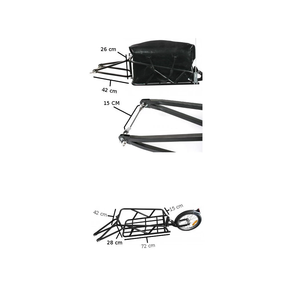Avec une structure en acier, la remorque a un poids de 10.7 kg. Elle est équipée d’un système d’amortisseurs au niveau de la roue arrière et peut supporter jusqu’à 30 kilos. Elle possède un solide espace de chargement de 67 x 40 x 31,5 cm. Un sac de transport noir entièrement imperméable est fourni avec la remorque. Il porte la mention de notre site Lecyclo.com et pèse environ 1 kg.